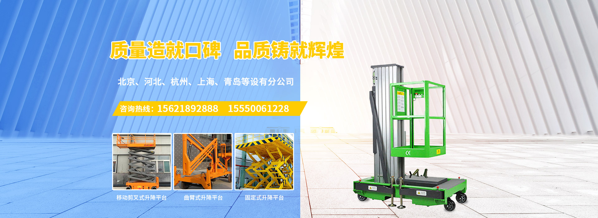濟南慶飛機械設備有限公司目前專心致力于液壓升降平臺領域。公司主要產品有:剪叉移動式升降平臺,剪叉式固定升降平臺、鋁合金直臂升降平臺、折臂式升降平臺、曲臂式升降平臺、車載式升降平臺、牽引式升降平臺、自動行走式升降平臺、移動式固定式登車橋、桅柱式鋁合金升降平臺、鋁合金升降舞臺、固定軌道臺面旋轉式升降平臺等,產品廣泛適用于電力、通訊、路燈、交通、交警、建筑裝簧、園林、廣告、高速公路、大型廠礦企業等領域,還可根據用戶的需求設計制造包括特殊尺寸、承載能力、防爆電器的液壓升降臺。